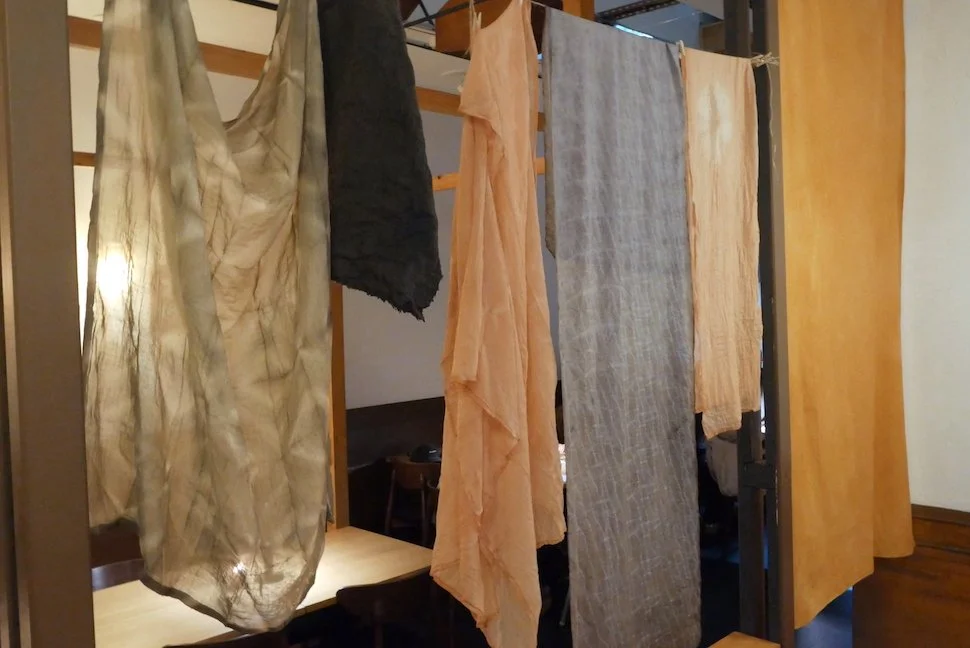 is a Japanese dyeing method in which natural and everyday materials such as flowers, herbs, vegetable peels, Coffee grounds, Tea are used to dye fabrics.